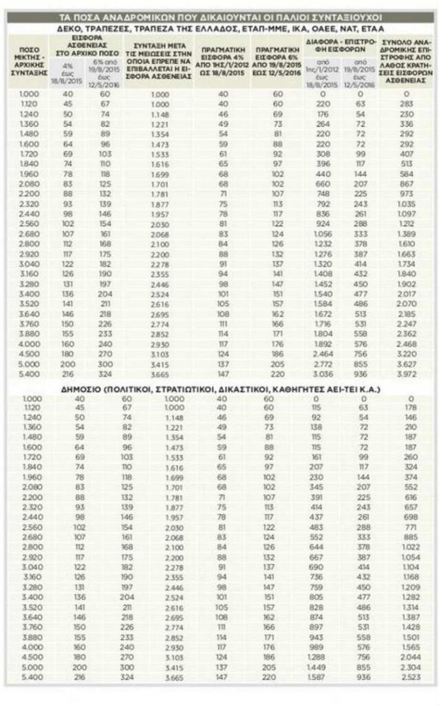 Όσοι παίρνουν σύνταξη Δημοσίου και είχαν αρχικό ποσό 2.080 ευρώ θα λάβουν αναδρομικά 552 ευρώ για το διάστημα από 1ης/9/2013 ως 12/5/2016 καθώς για αυτούς τους 23 μήνες η εισφορά ασθενείας θα έπρεπε να μπαίνει στα 1.701 ευρώ. - Όσοι παίρνουν σύνταξη Δημοσίου και είχαν αρχικό ποσό από 2.080 έως 2.800 ευρώ θα λάβουν αναδρομικά από 552 έως 1.022 ευρώ.