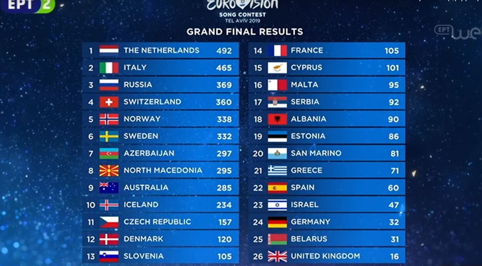 Η Ολλανδία κέρδισε την φετινή Eurovision με 492 βαθμούς.